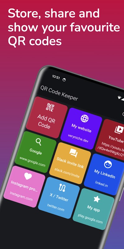 Add a QR code by scanning an existing QR code or enter the URL, make it easy to find by adding a color, icon & name.
