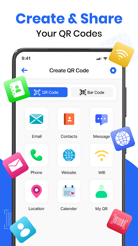Simply scan QR Codes & Barcodes, Create and Share QR code & business card
