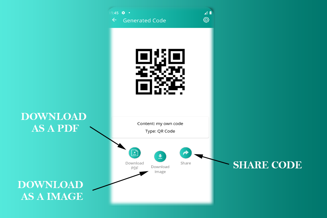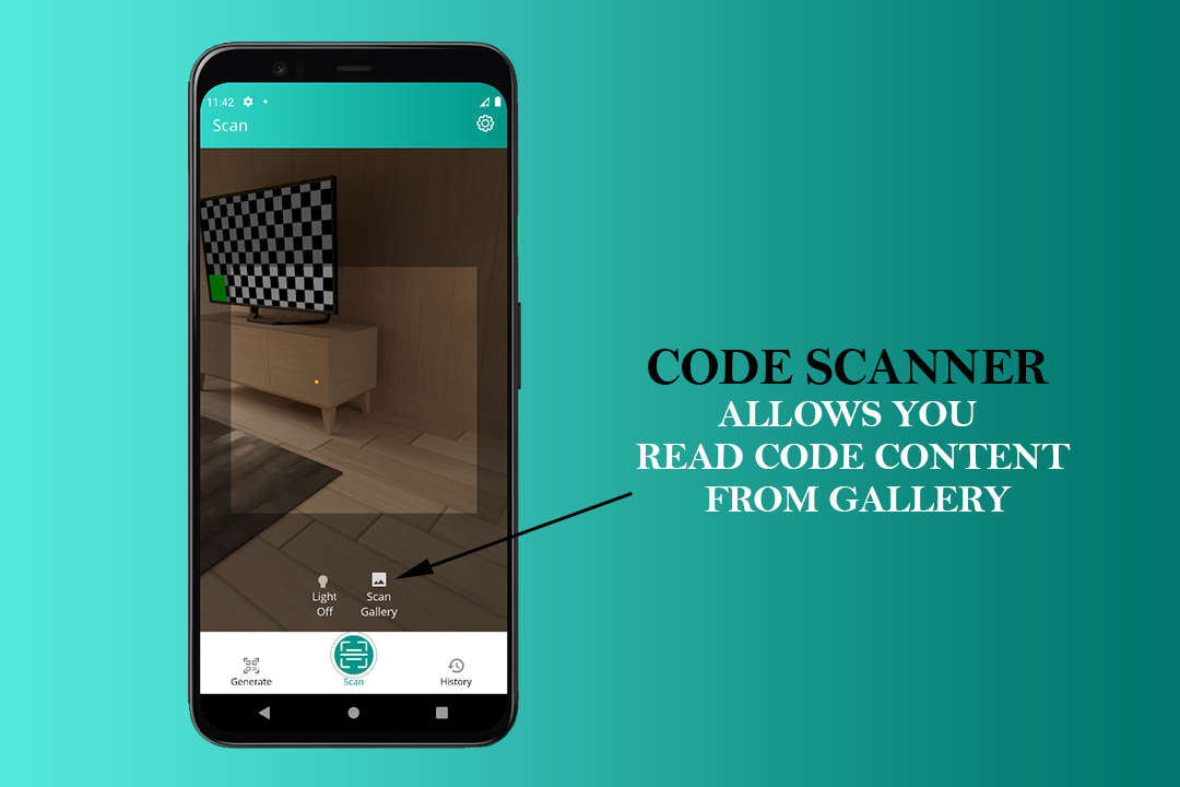 Code Scanner is also able to scan the codes from your Gallery, select the code and click extract code and you will see code content, you can also read codes in dark places by using flashlight, Share scanned or created code, download image or PDF of your generated code to share it or print it.