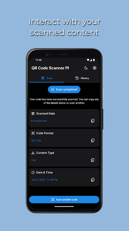 This offline QR code scanner processes everything directly on your device. Your scan history remains stored locally and can be managed anytime. You control what opens and when — nothing launches automatically.