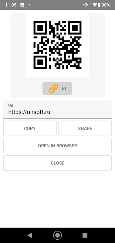 - Generates QR codes: URL, Email, Text, Phone, MeCard, etc.
