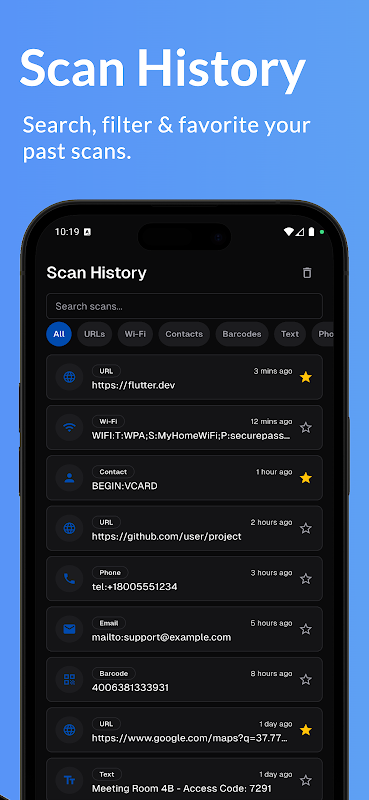 • Auto-detect content type (URL, Wi-Fi, Contact, Phone, Email, Text)