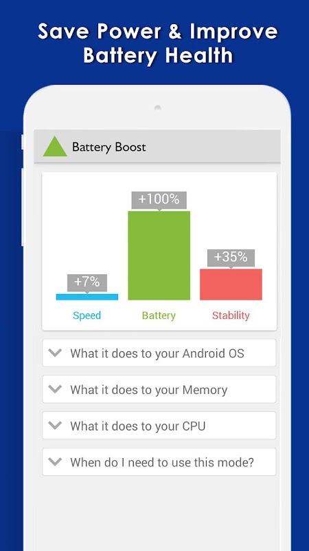 Stability Boost mode make your smart phone more stable in overall condition. This mode hibernates all the poorly programmed apps and settings to consume battery and processor speed, enhancing overall condition of your android smartphone.
