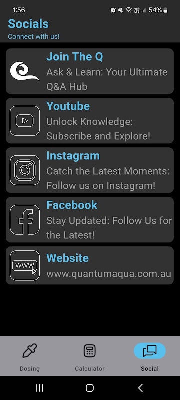 This app is a free, easy to use dosing calculator for aquarium hobbyists to use that works with Quantum's product lines, check out the socials tab for how to stay in touch with our latest updates and news.