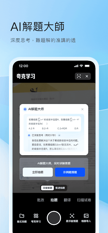 Quark, your AI all-round assistant, makes work and study more efficient! "Deep Search" solves difficult problems and provides high-quality solutions from multiple angles; "Photo Search" gives analysis in seconds and breaks down the detailed problem-solving steps step by step.
