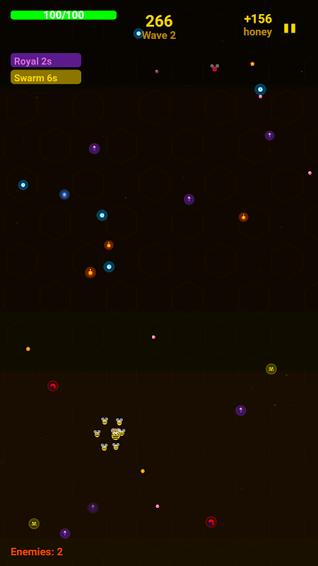 Tap and drag to move your Queen across the battlefield. She automatically fires stinger projectiles at the nearest enemy, so you can focus on dodging attacks and collecting resources. Your loyal worker bees fly alongside you, gathering nectar and pollen to fuel your war effort.