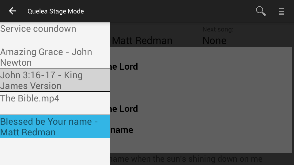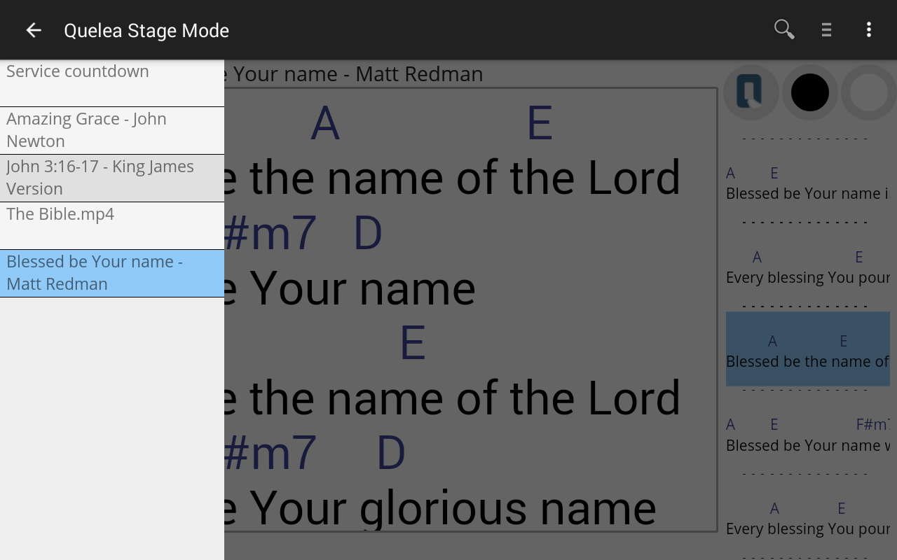 Quelea Stage Mode is a tool for worship leaders that gives you control over the free church projection software Quelea. It is a mix of Quelea's built in features Mobile Remote and Mobile Lyrics, adapted to be used on stage.