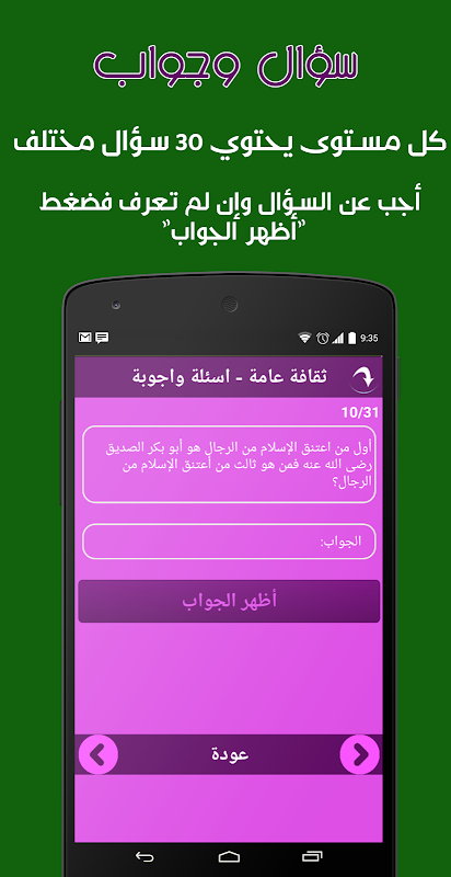 "Question and Answer - general culture" application that contains a historical, cultural, scientific and mathematical questions Islamist group and every question you have four options to him and one of them is the right choice.