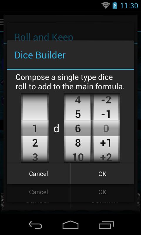 The dice can be added at will and organized in dice bags. Each die is defined by a formula such as 2d6+5 as well as special functions like rak(1d6,4,3) that allow to emulates the most complex game systems. An handy formulas builder simplifies the process, and allow to access to an online help. Check the list of all supported functions here: http://goo.gl/mZkcQS
