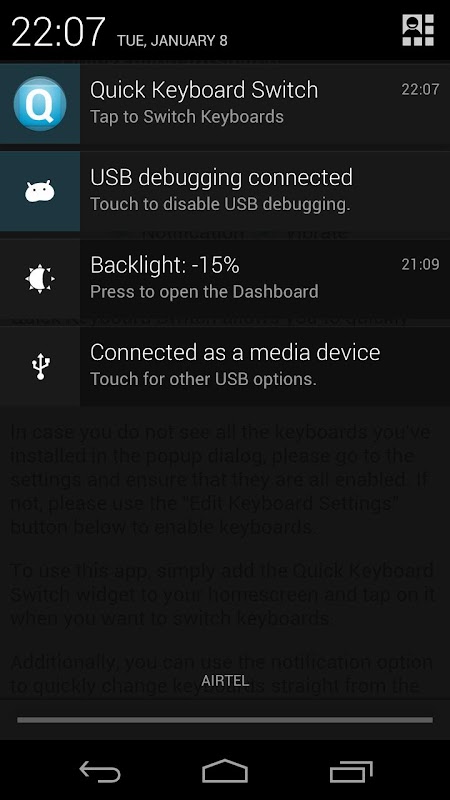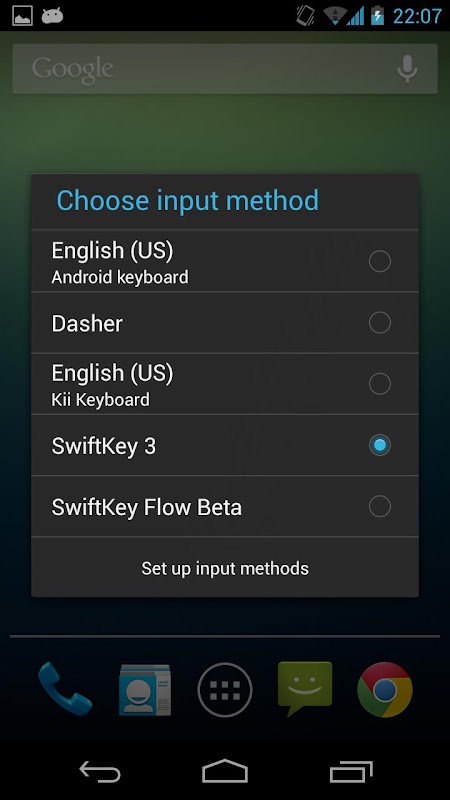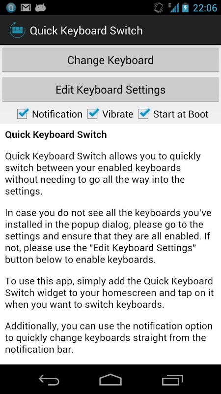 This simple app allows you to use a homescreen widget to quickly toggle the default keyboard from the enabled keyboards on your Android device.