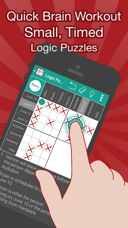 A logic grid puzzle with a twist! Small logic problems use the same principles as larger puzzles, but are faster to complete and work well on phone screens. One free puzzle every day, or buy a volume of puzzles if you can't wait! No ads, no popups, no nags, no interruptions.
