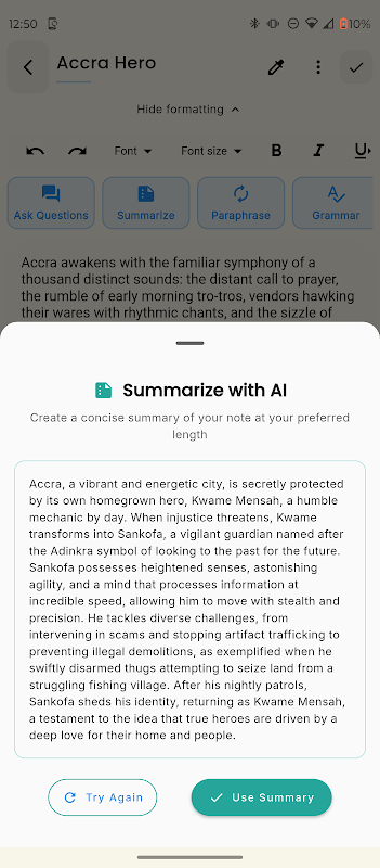 Generate clean, concise AI summaries from any content in your notebook — notes, recordings, web pages, or YouTube videos. Great for quick reviews before exams, briefings before meetings, or refreshing your memory on any topic.