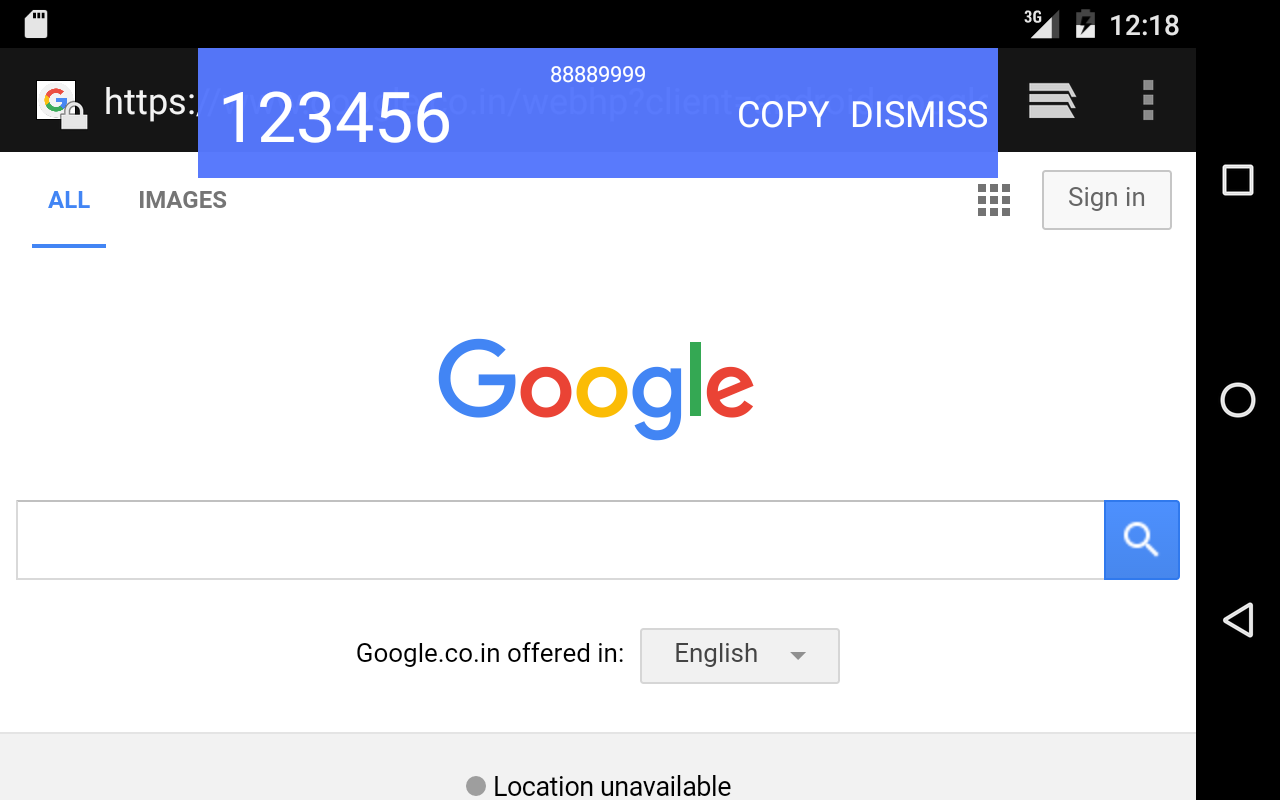 For users handling with money transactions online (online shopping, bank transfers, mobile recharge/top-up), it can become cumbersome to deal with One Time Password (OTP) based authentications. The user has to switch to the messaging app, open the appropriate SMS and memorize/copy the OTP every time. With QuickOTP, you can bypass this process. QuickOTP displays the OTP in a lucid and non-intrusive manner along with an option to quickly copy the OTP as soon as you receive your OTP message. The user does not have to switch apps during the transaction.