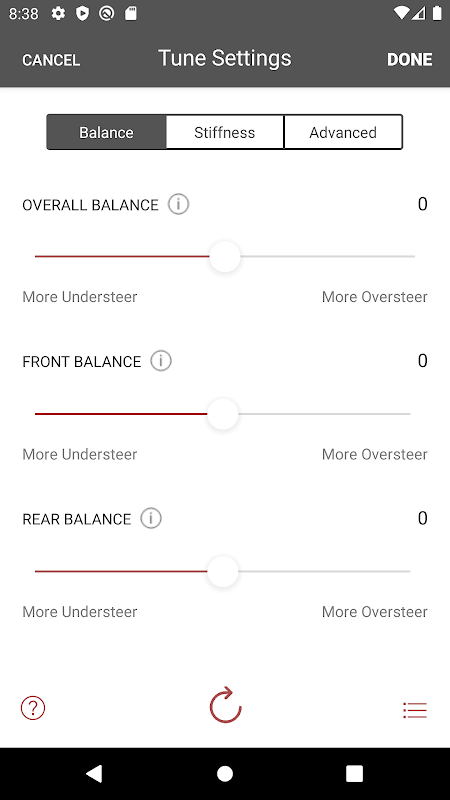 Based on the provided data a tune is calculated. ARBs and spring rates are provided with 3 fraction digit precision, set the in-game values to nearest value.