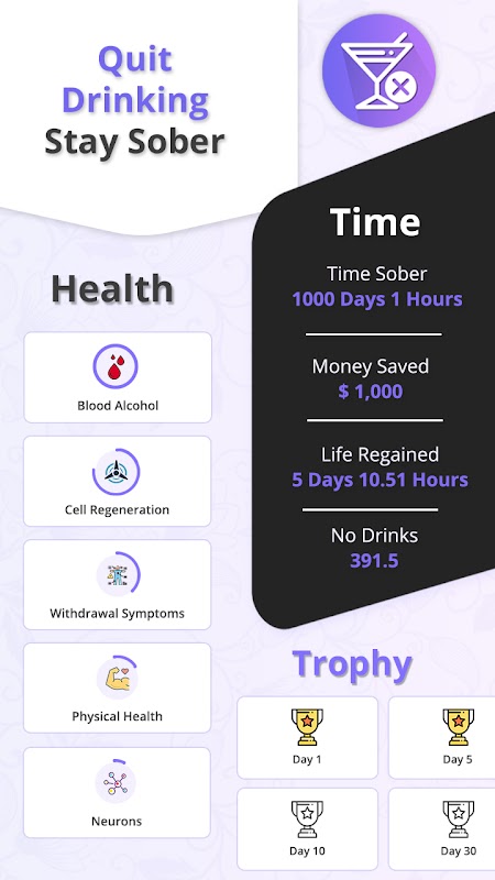 Track sobriety, save money, and stay motivated to quit drinking alcohol.