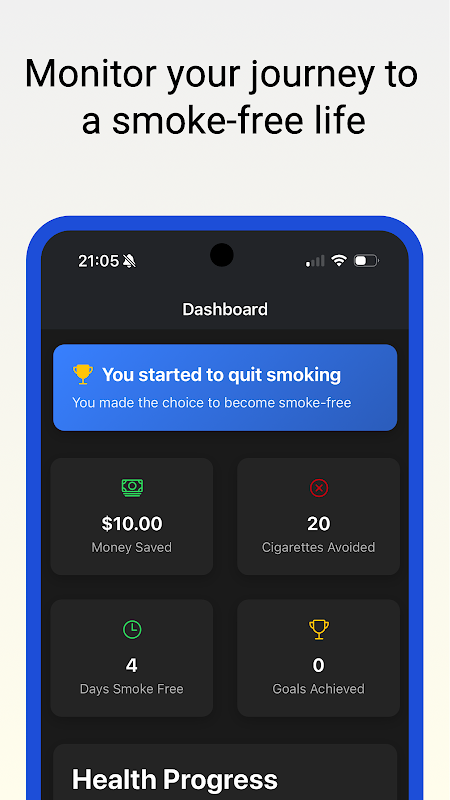 With real-time tracking, monitor money saved and cigarettes avoided, while celebrating your progress with achievements. Manage cravings using a personalized journal and stay motivated with insightful dashboards.