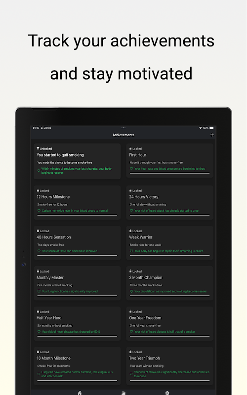 Start your quit smoking journey with our personalized tracking app. Watch as your health improves and savings grow, while reaching important milestones on the path to being smoke-free.
