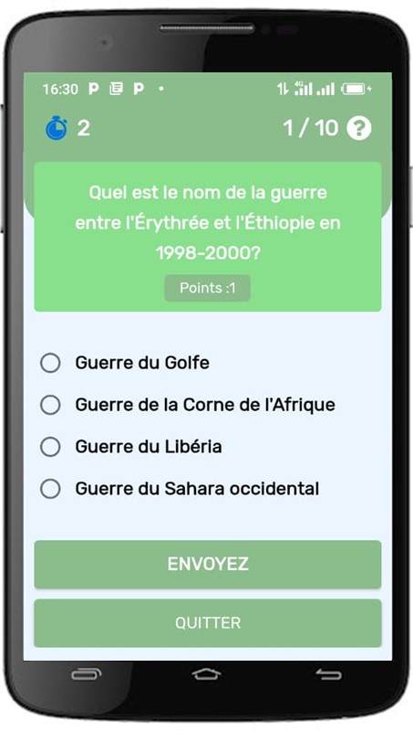 The objective of the application is to help users learn facts about Eritrea's culture, politics, economy, sports, history and geography in a fun and interactive way, through quizzes of varying difficulty.