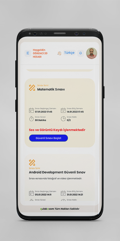 Qulakexam is an online exam system that provides easy and safe online exams with its user-friendly interface, provides feedback by creating analysis reports thanks to its artificial intelligence-based modules, offers a flexible question preparation platform, and provides a high level of exam security thanks to its exam security modules. Qulakexam provides information security standards with end-to-end encryption.