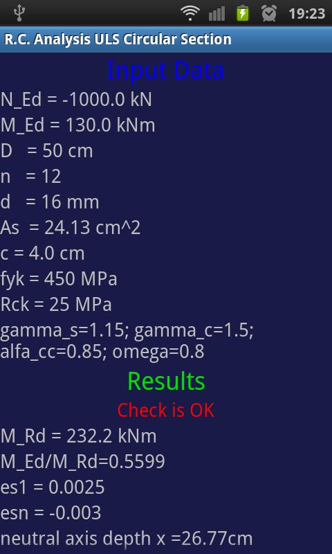 The App allows the users to check circular concrete sections for the bending moment with or without axial force in ultimate limit state accordance with the requirements of the Italian (NTC 2008) and European (Eurocode 2 or EC2) building code.