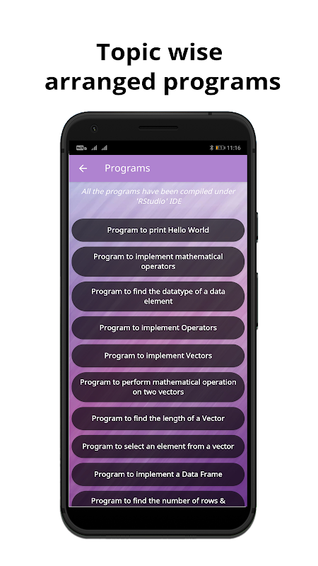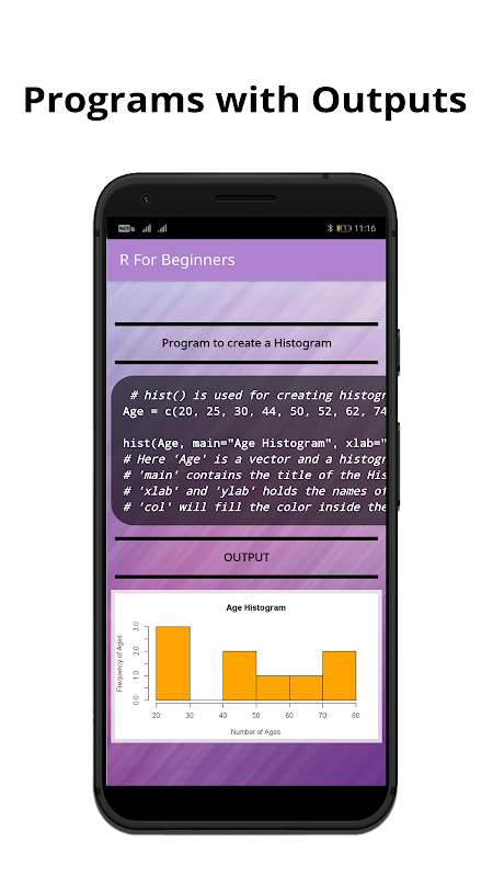 Learn today's one of the most in-demand language R directly from your mobile phone. With our app you'll be learn to code right away in almost no time at all. All of our programs are explained with comments for better understandability.