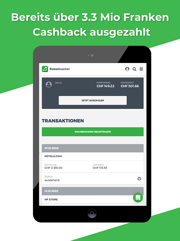 Cashback is an amount of money that you receive back for your purchases when you shop through our platform. If you use our app for your online purchases in one of our partner shops, we receive a commission that we share with you. As soon as you have completed your order, the transaction and your cashback amount will appear in your user account. From a total amount of CHF 20 you can have your money transferred to your bank or PayPal account. Very simple and uncomplicated!