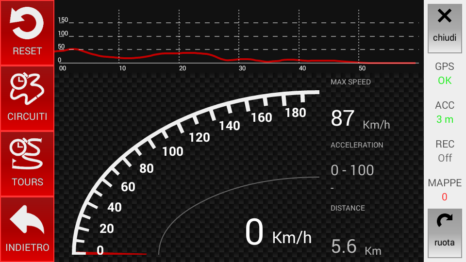 For a more detailed analysis of the sprint will be shown a graph representing the speed curve over time, from which you can extract interesting information as a point of maximum torque, gear change time shifting and much more. An application for your all-round performance on the track!