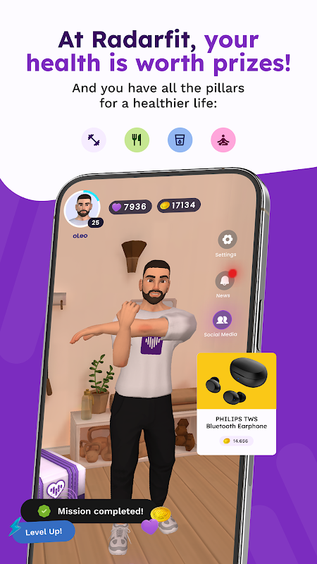 With Radarfit, every healthy action recorded is worth fitcoins, which can be exchanged for real prizes, such as physical products, vouchers and even donations to social causes. Here, you take part in exclusive challenges, receiving points for your healthy habits, climbing the rankings and gaining visibility on the exclusive social network.