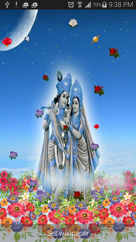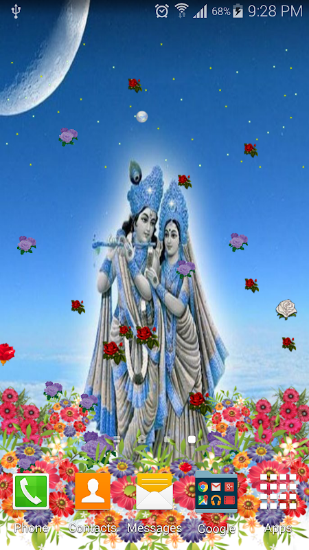 Radha and Krishna beautiful live wallpaper with flowers and twinkling stars.
