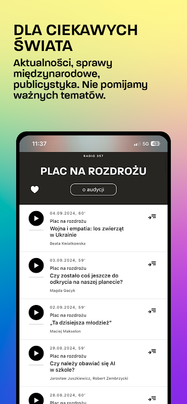 The only official application of Radio 357. It is an ambitious radio without advertising blocks. Radio personalities, music, journalism, reportage, culture, sports and news. Start your day with Marcel in the morning. Enjoy the music served by Marek Niedźwiecki, Piotr Kaczkowski, Piotr Stelmach and a strong music editorial team. The Popołudniówki team sums up the day for you. Kuba Strzyczkowski asks what you think about it. Favorite artists in an unusual hosting role? This is also with us! In our studio, they present their musical selections for you, among others: Ralph Kaminski, Tomasz Organek, Krzysztof Zalewski, Baasch, and in the podcasts Daria Zawiałow, Edyta Bartosiewicz, Kwiat Jabłoni and others. That's right - podcasts! There's plenty to choose from. Lots of offers for demanding customers - with the Radio 357 quality mark. Install, create a Your 357 account and make yourself comfortable for longer!
