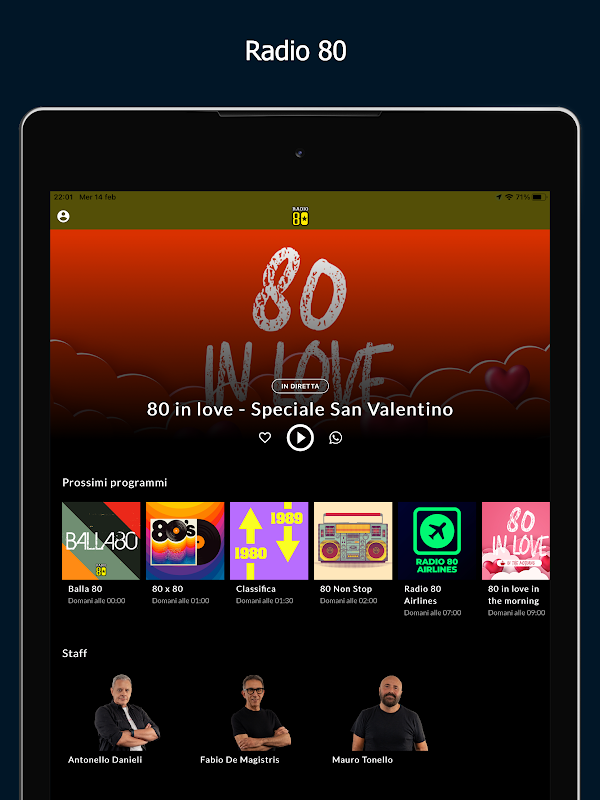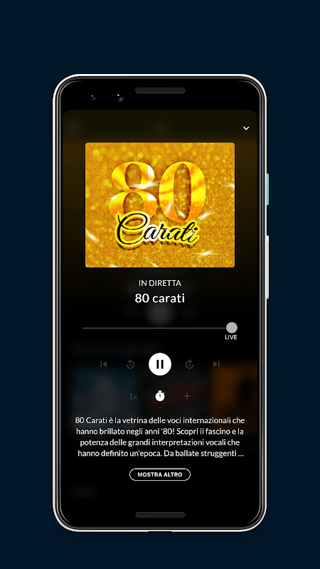 Explore the Radio 80 universe through our app! Immerse yourself in the unforgettable rhythms of the 80s as you discover the schedule full of timeless hits, reliving the golden era of music. Discover the program times and get to know who, every day, guides you through the successes of the past. Listen to Radio 80 live wherever you are and let yourself be transported by the sounds that have marked an entire generation. With Radio 80 you travel through time: not only music but also cinema, commercials and television programmes!