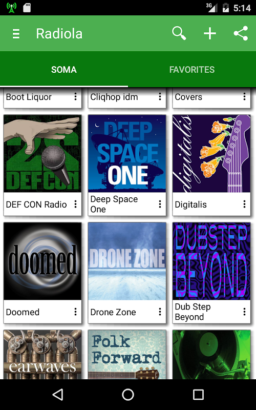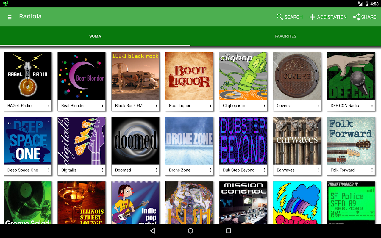 Player for online radio stations with preselected high-quality music streams.