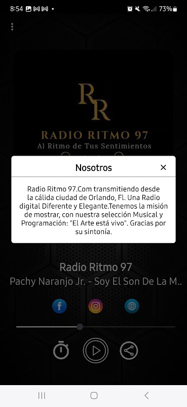 Radio Ritmo 97, transmitting from the warm city of Orlando, Fl. A Different and Elegant digital Radio. We have the mission of showing, with our Musical and Programming selection: "Art is alive." Thank you for tuning in.