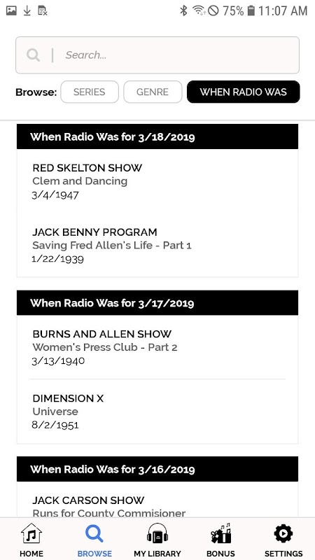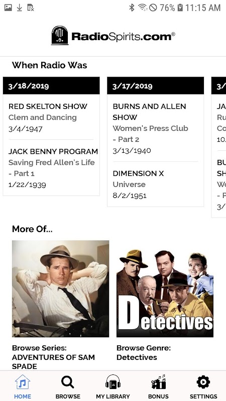 Featuring great series such as Sam Spade, Jack Benny, Johnny Dollar, Fibber McGee and Molly, The Green Hornet, Life of Riley, and many others. An optional subscription service allows you to stream and download even more programs on-demand from our vast library of thousands of classic radio programs.