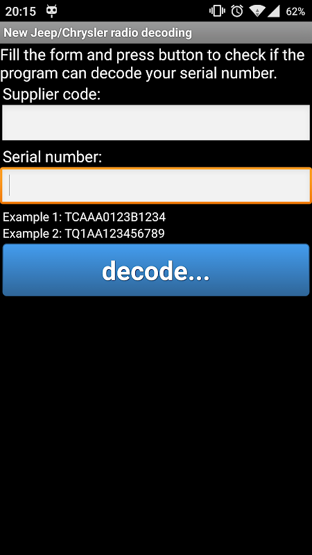 Generates radio unlock code for Jeep and Chrysler by its serial number.
