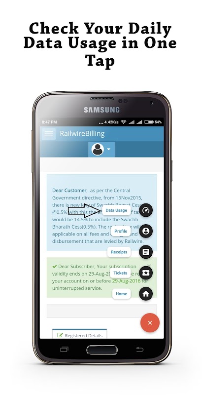 • Track your daily Data Usage, Receipts, Current Balance, Monthly Limit, Tickets, Change your password
