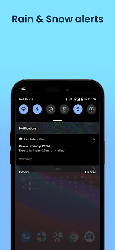 Realtime radar with notifications for rain, snow and meteorological alerts