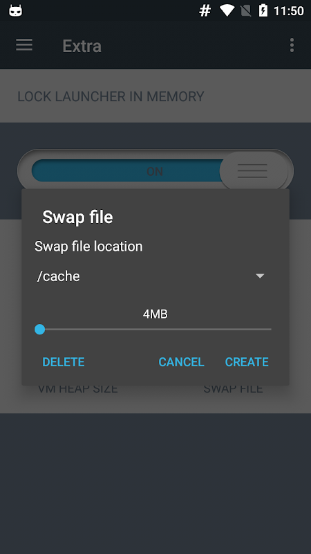 You can find here also some other useful features. Section "Dashboard" includes your memory information, so you can monitor your free and used memory. Users who have problem with restarting their launcher can use feature "Lock launcher in memory" which prevents your launcher from being killed. You can also use this application for managing and creating swap files to virtually enlarge your RAM size. And last but not least you can use this application for setting VM heap size and control maximal size which each application can use for its data.