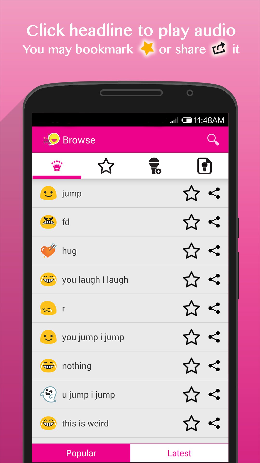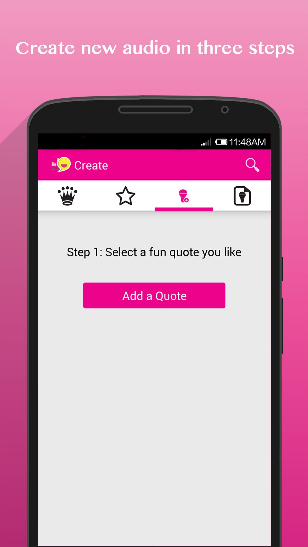 Create fun audios with imagination! You may choose a quote from celebrities; then record your own voice that immediately follows. Share audio with friends and have a big laugh!