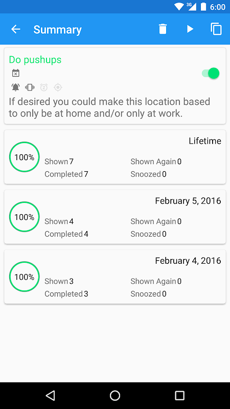 Track how well you follow your reminders with click vs. dismiss notification tracking. Check the reminder's summary page for all the statistics. Statistics are tracked on a per day basis along with lifetime tracking. Export the data as a .csv for analysis in a spreadsheet application.