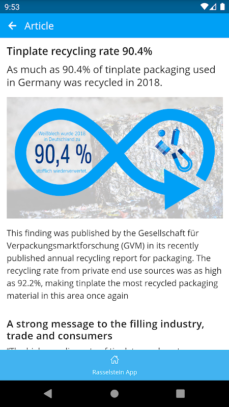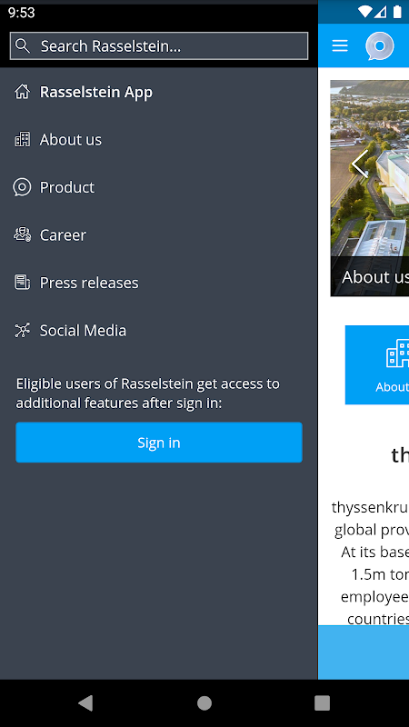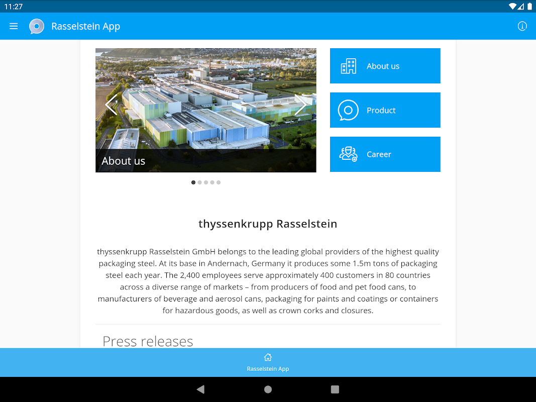 The Rasselstein App provides up-to-date news, concise company information, and an overview of products and services offered by thyssenkrupp Rasselstein GmbH.