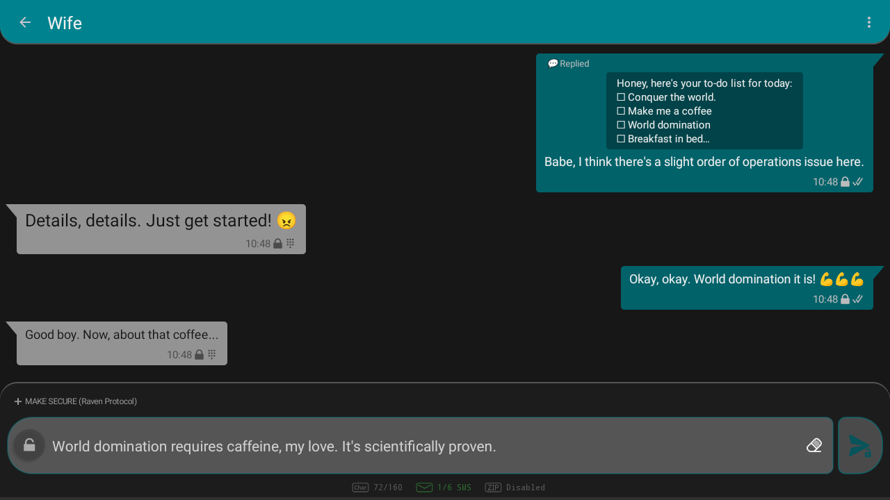 Operates completely offline, making it useful in situations without internet access and unlike other messaging apps, provides a trustworthy platform without a central server on the internet to store messages or keys.