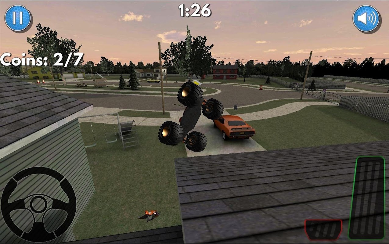 You control the car with on-screen touch controls. Use the steering wheel to turn the car, and press on the pedals to move the car.