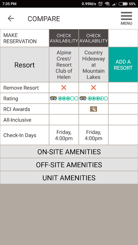 The RCI Affiliated Resort Directory feature allows users to search or browse RCI Affiliated Resorts across the world. Users can not only view resort information and amenities, but they can also view available resort videos and photos as well as easily compare multiple resorts at the same time. Further, they can save resorts into a local "My Resorts" list and share resort information with friends via email.