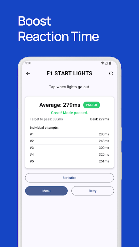 • F1 Start Lights: A fan favorite! Tap the instant the F1 lights go out. This F1 start lights reaction test is the ultimate drill for your raw reaction speed.