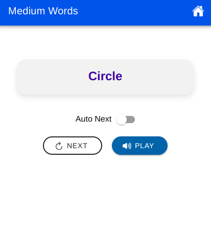 Choose from Easy Words (1-3 letters), Medium Words (up to 6 letters), or Hard Words (complex, long words). Practice at your own pace with Auto-Next and Play features.