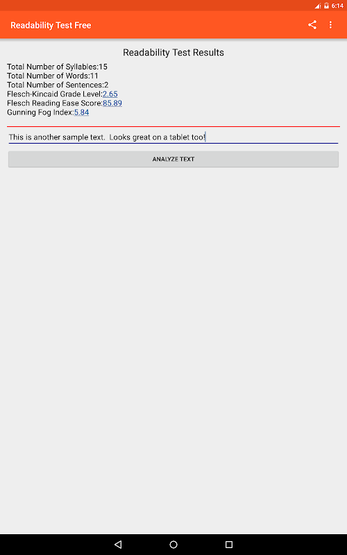 This app calculates the Flesch Reading Ease Score (FRES), the Flesch-Kincaid (F-K) Grade Level, and the Gunning Fog Index scores.