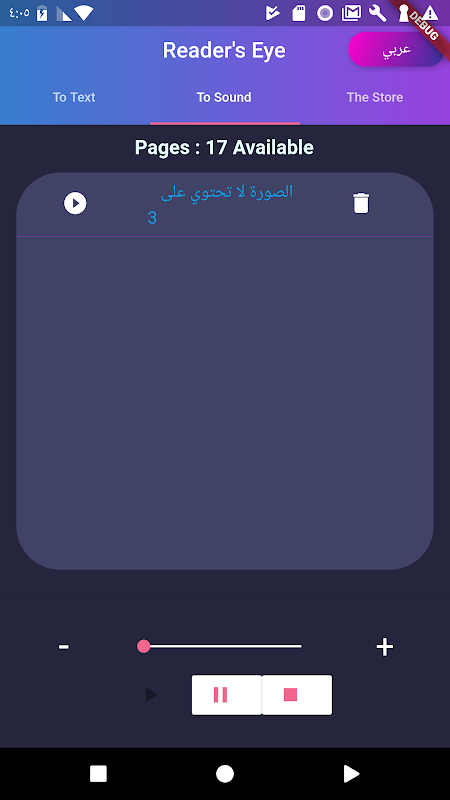 You can share text files to other applications. When playing audio files you can control the speed of the reader through the speed indicator.