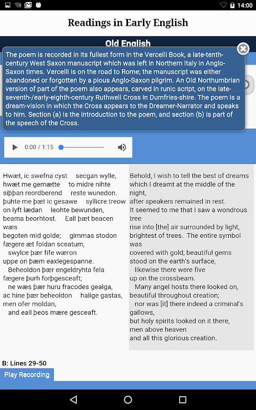 This package consists of a set of readings of Early English texts. The texts are divided into three Sections: Section A (Old English Texts), Section B (Middle English Texts) and Section C (Early Modern English Texts). However, it should be noted that texts spanning the transition between OE and ME, and between ME and EModE, are also included. For pedagogic reasons, the editorial principles adopted vary from text to text, and between sections.