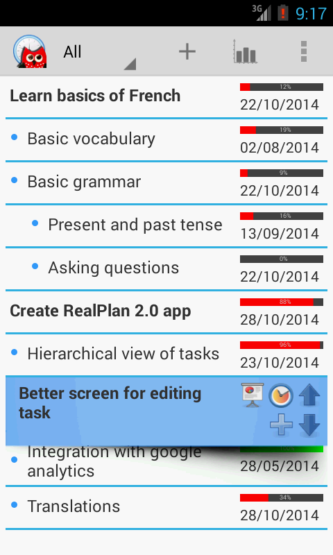 The planner tracks your progress and based on this data it predicts when your tasks can be completed. It analyzes how much time you spent on executing tasks of given a category on different days of week. It also tracks how well you perform completing the tasks. Sophisticated planning algorithm uses this analysis to constantly tell you predicted completion dates for your plans.